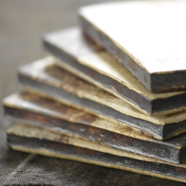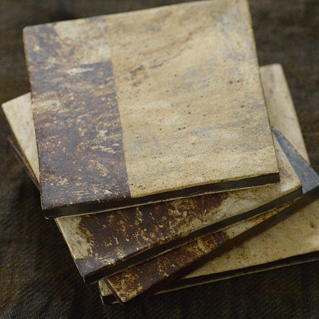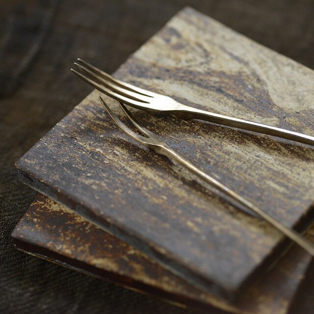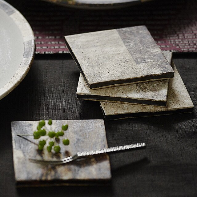 古荘美紀 タイル皿 伊豆の陶土をそのままの状態で叩いて薄く伸ばし、生の素地に貼り付けて形にしている古荘さんのエネルギッシュな作風に惹かれ、この大きさの角皿も作っていただきました。自然に出来た土の模様をダイレクトに感じながら1点1点異なる表情が楽しめるので豊かな気持ちでお食事(お茶)が出来ます。お料理は和洋中韓なんでも合いそうです。秋のテーブルで、串揚げ&銀杏を載せてみたい…と直感的に思いましたが、食後のデザートにもオススメですよ!