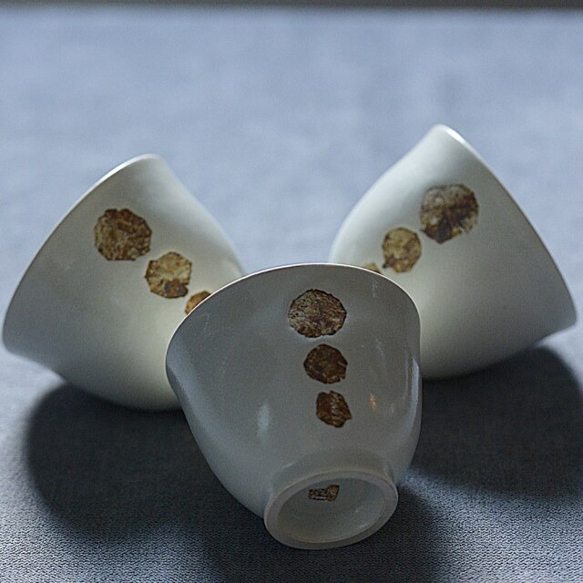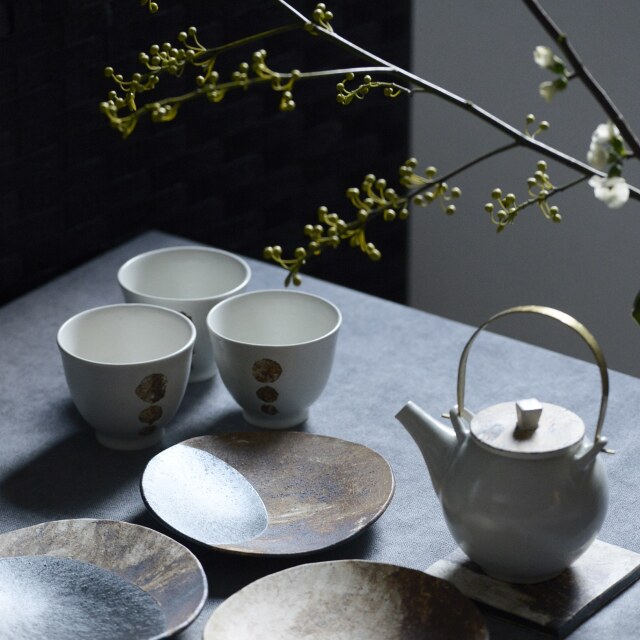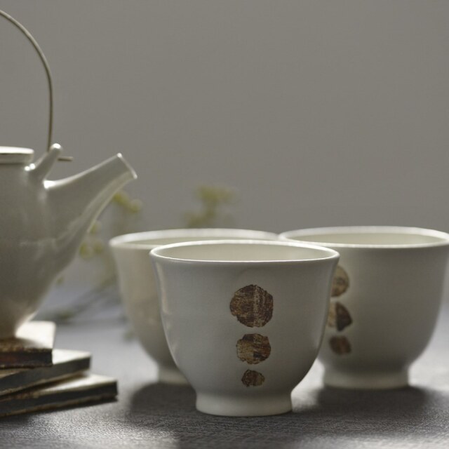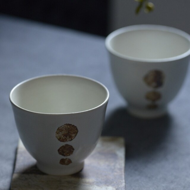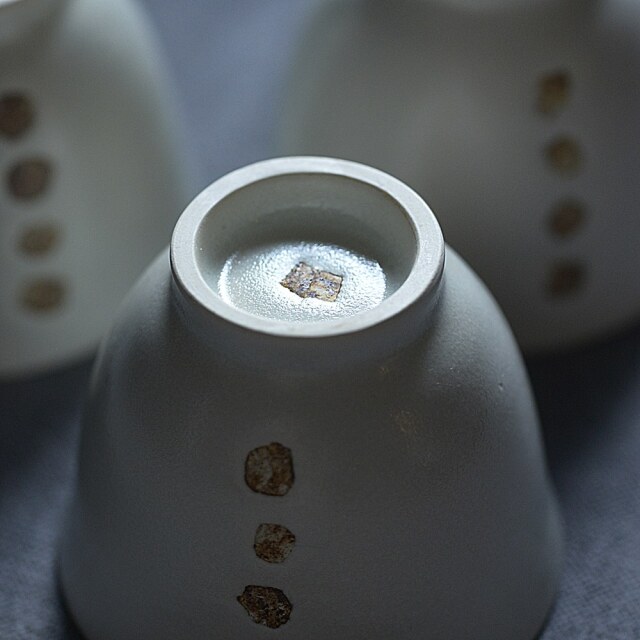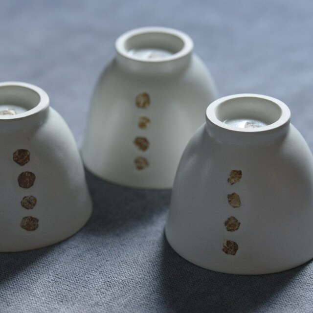 古荘美紀 湯呑 こちらは我が家でも愛用しているお湯呑の大き目バージョン。丸い窓が3つ、裏側には小さ目の窓が4つ。そこに伊豆土の表情がのぞけるデザインとなっています。容量は約150ml(8分目) 普段使いにちょうどいいサイズ感です♪