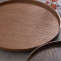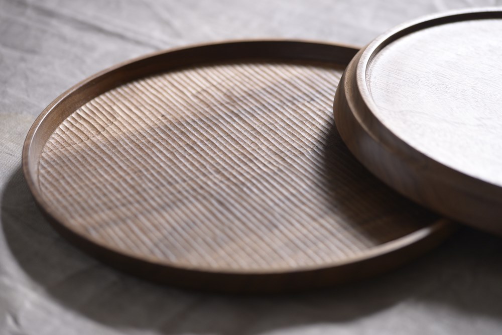 ふるいともかず 天然木 丸盆 ふるいさんの代表作品でファンも多い「丸盆」です。表面の彫は一行づつ丁寧に刃物で切り込んだ削り跡。手仕事ですので1枚毎に表情が違います。ふるいさんの想いが詰まった温かみのある作品です。