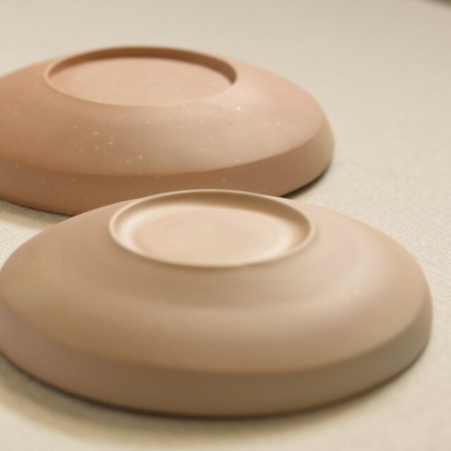 タタラ(板状に成形した土)を貼り合わせた、中空構造の器です。裏側の底や側面に空気穴がありますので、水につける時には水が入らないようご注意下さい。もし水が中に入った場合は、穴を下にしてタオル等の上にしばらく置いておくことで水は抜けます。中空構造の器ですので、重い物を載せるなど、強く力が掛かるような扱いは避けてください。
