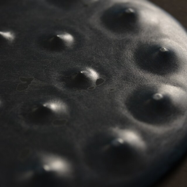 電気窯での酸化焼成です。半磁器土に、青顔料コバルトなどをこすり込んでいます。顔料のバランス加減で、光沢状の青黒〜マットな黒グレー等、色々な表情となっています。薄く白っぽく見えているものは、素地の土が見えているところです。光沢状の点々は、囲炉裏灰(小渕沢にある国重要文化財「旧平田家住宅※」の囲炉裏灰)を吹き付けたものです。