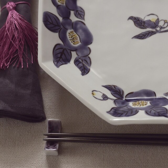 瑛生の器(九谷美陶園) 瑛生の器 九谷美陶園 皿椿文様八角八寸 9月に工房を訪れた際、その場で目を奪われた紫色の椿文様が印象的な一枚。数々の美しい器に目移りしながらも、少しクールな表情が魅力のこの八角皿を選びました。繊細な椿の花びらが描かれた紫色の文様には、よく見るとお花の中心に黄色の釉薬が施されています。この暖かなアクセントが、他の暖色系の器とも相性抜群で、食卓に一体感を生み出してくれるのが嬉しいポイントです。(電子レンジ対応,食洗器対応可) サイズ感も使い勝手が良く、煮物をどんと盛り付けたり、前菜やメインディッシュを華やかに演出するのにもぴったり。シンプルながらも存在感のあるデザインは、和洋問わずさまざまなシーンで活躍してくれる一枚です。
