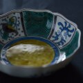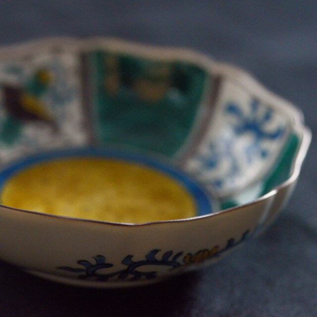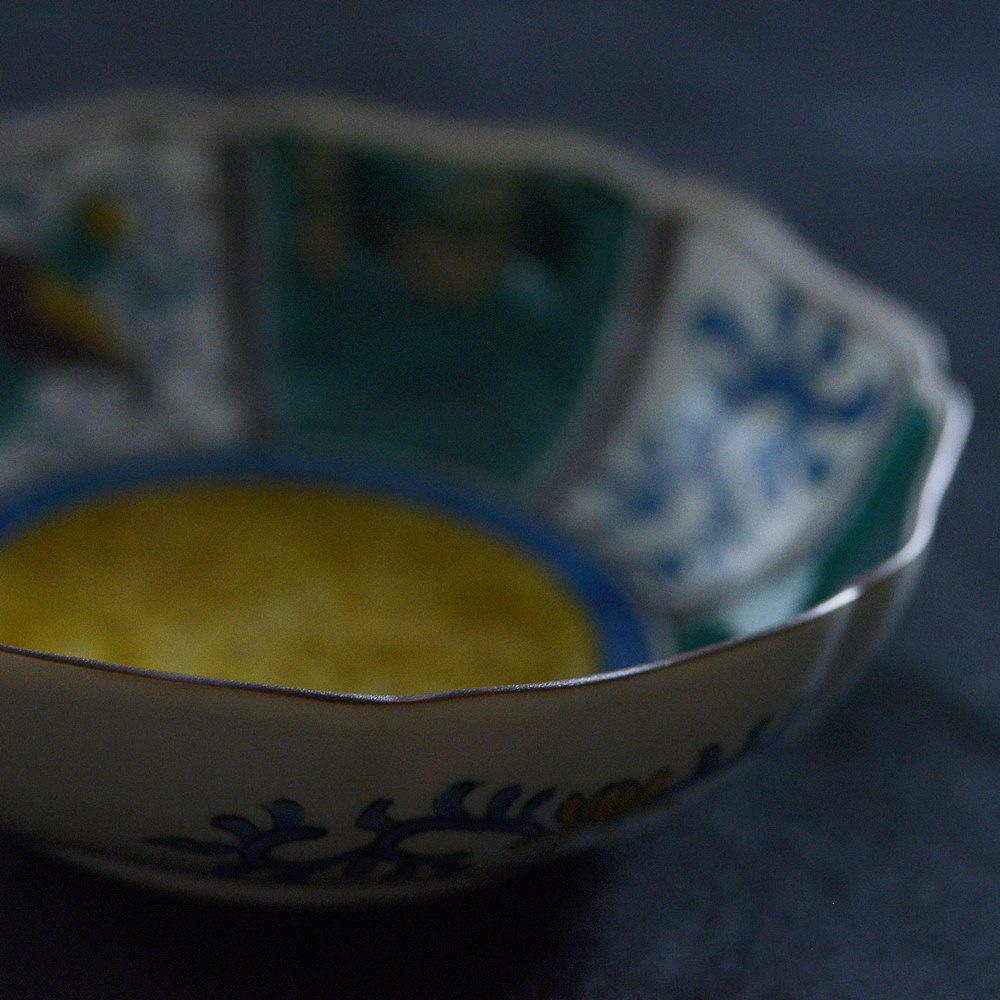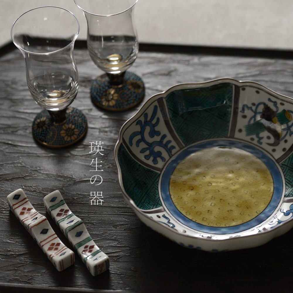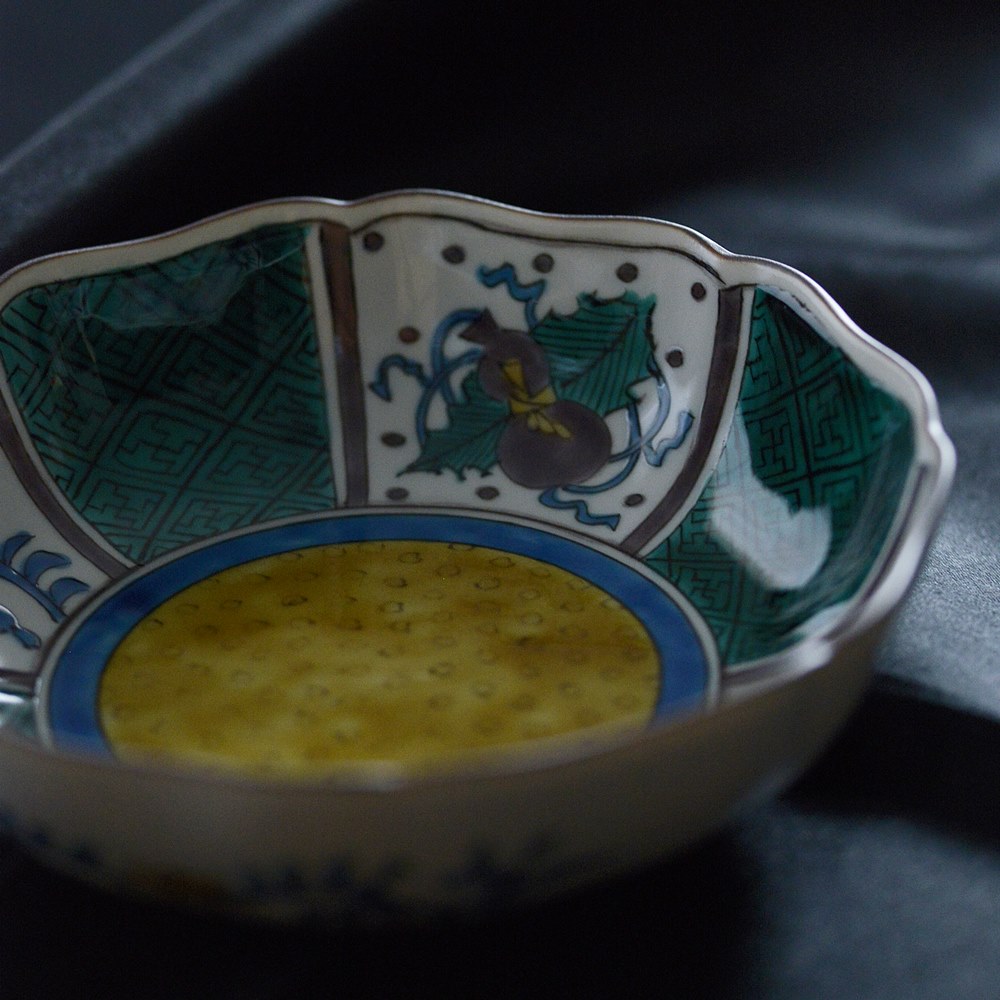 瑛生の器(九谷美陶園) 青手宝文様五寸輪花鉢 華やかな青手の宝文様が印象的なこちらの輪花鉢は、特別な日のための器というよりも、日常の食卓に気負わず取り入れられる一枚。普段の食事にさりげなく彩りを添えてくれます。模様が賑やかで存在感があるので、シンプルな緑のサラダを盛るだけでもぐっと映えるのが魅力。和食はもちろん、洋風のマリネやデリ風のおかずにもよく合い、食卓に明るさと華やかさをプラスしてくれる器です。