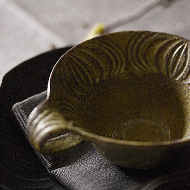 ティーカップ(ソギ)|村上直子 口縁から見込みへとなだらかに続くアンティーク調のデザインが魅力的な、お洒落なティーカップです。広口のため小鉢のようにも使え、使い方を考えるのが楽しくなる器です。モスグリーンには白いポタージュスープがよく映え、夏にはアイスクリームなどの冷たいデザートにもおすすめ。季節を問わず、年中食卓で活躍してくれそうです。