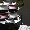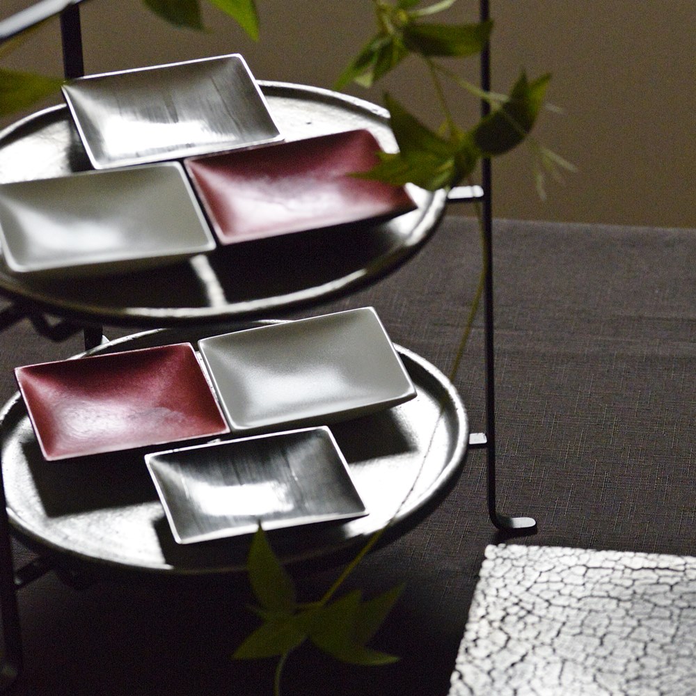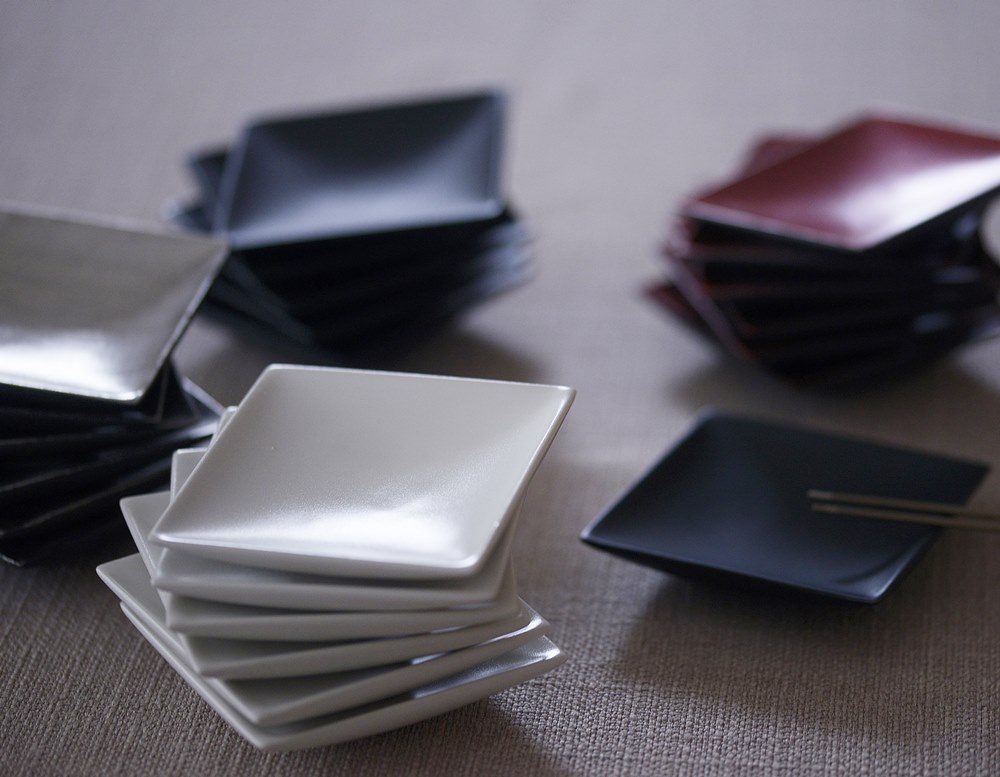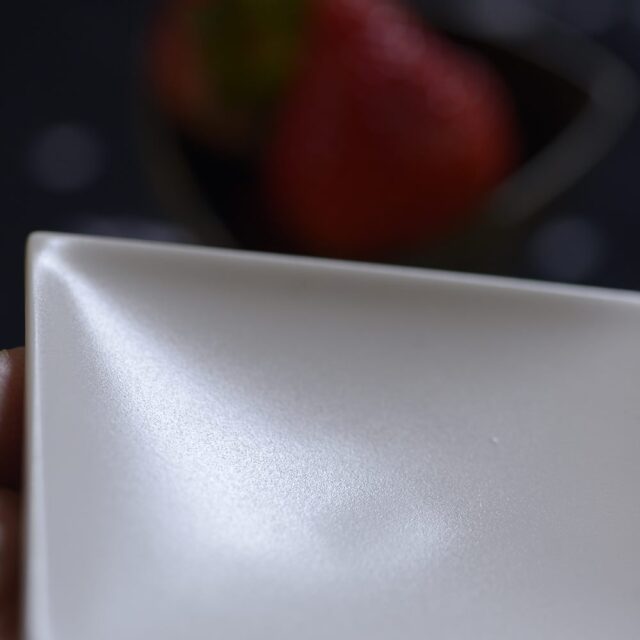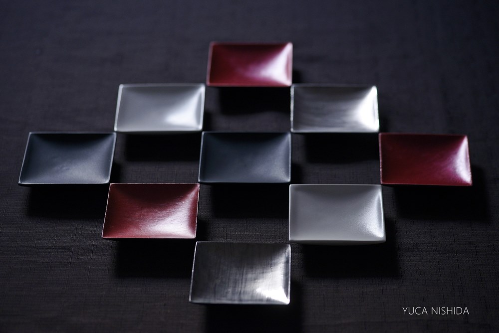 にしだゆか 小皿 これまでは白磁とラメ赤の2色展開でしたがこの度プラチナも加わり3色に♪ このプラチナは刷毛で施された縞模様が1点1点異なり、それぞれの個性が出ていて素敵です!!これまでの2色使い市松模様もカッコいいけれど、このプラチナを仲間に入れてより一層モダンなコーディネートを楽しまれてみてはいかがでしょう? 白色のほうは滑らかな質感。触ったときに「あぁ私の好きなテクスチャだ」と一目で気に入りました。ラメ赤は落ち着いたまるで、折り紙の中から出てきそうな赤です。金属っぽさのある光沢もオシャレ。
