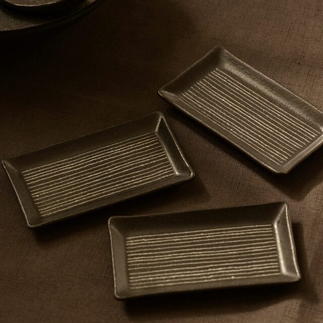奥田章 黒十草 のり皿 金彩の次は十草タイプののり皿をご紹介いたします。細かい十草柄でお料理が映えます!このお皿の上には刻んだ薬味や一口おやつ、ナッツ、生チョコレート等、お茶やコーヒーと一緒にお出しする時に♪もちろん、海苔を載せるときに重宝します^^