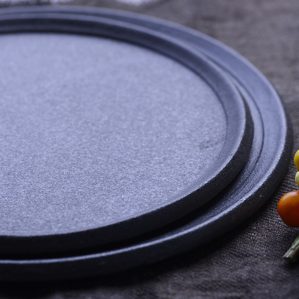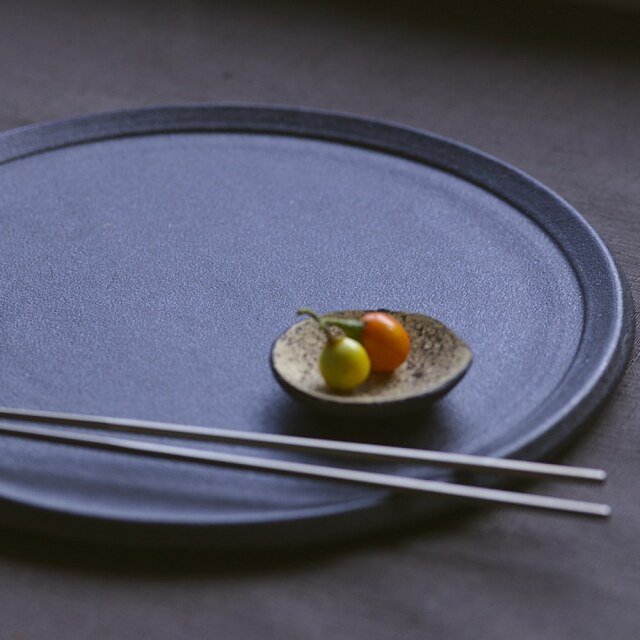 大野香織 リムプレート 今回は「あたら夜(黒)」の7寸と8寸が入荷しました。ザラリとした質感が料理をぐっと引き立て、食卓に洗練された雰囲気を添えてくれます。今回の入荷分は、従来よりリムの幅が少し狭くなり、よりスタイリッシュでシャープな印象に。どんな料理もすっきりと美しく映えるフォルムです。7寸は取り皿や一品料理に、8寸はメイン皿やワンプレート使いにぴったり。和洋を問わず盛り付けを楽しめる一枚で、使うたびに新しい表情を見せてくれます。
