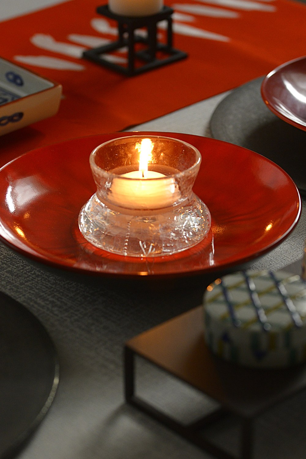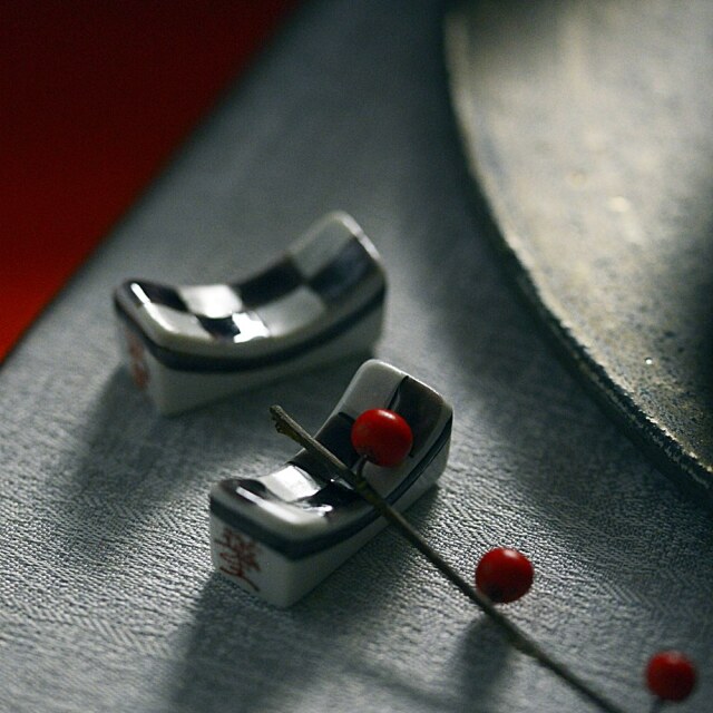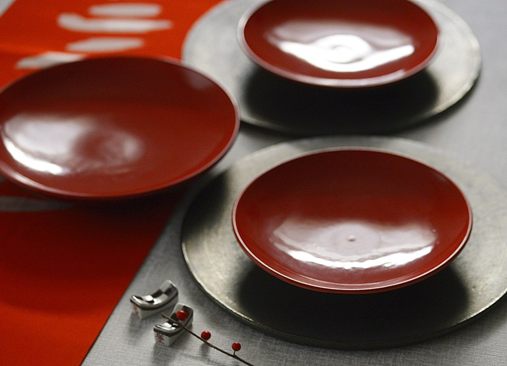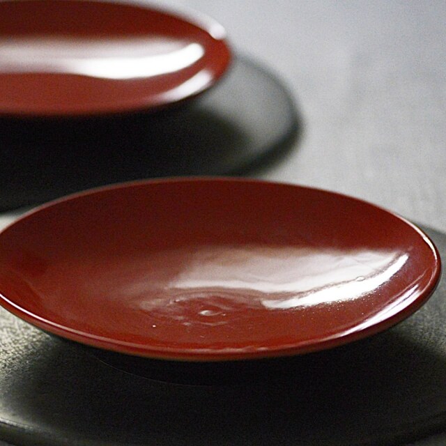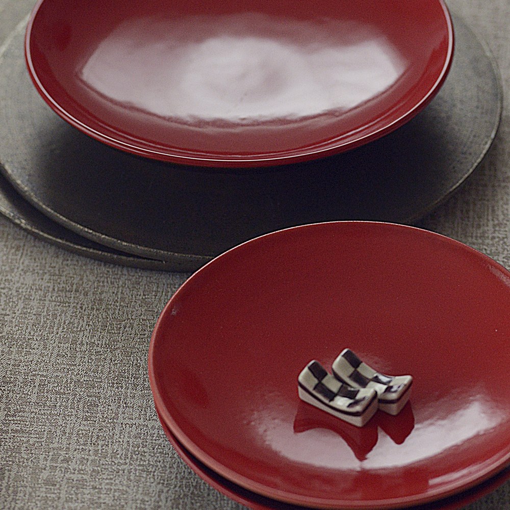 新年の食卓へ、上質な華やぎを。set♪朱に近い深みのある赤色で、ほどよく立ち上がりのあるプレート。その存在感を受け止め、より一層引き立てる組み合わせとして、シルバーブラックの9寸プレートを合わせました。色のコントラストが美しく、モダンでありながらどこか凛とした華やかさを感じさせるセットです。差し色として添えた市松箸置き(紫)は、このコーディネートのアクセントとしてセレクトしました。こちらは新春企画としてサービスでお付けしております。新年の特別な食卓にはもちろん、少し背筋を伸ばしたい日の普段使いにもおすすめのセットです。
