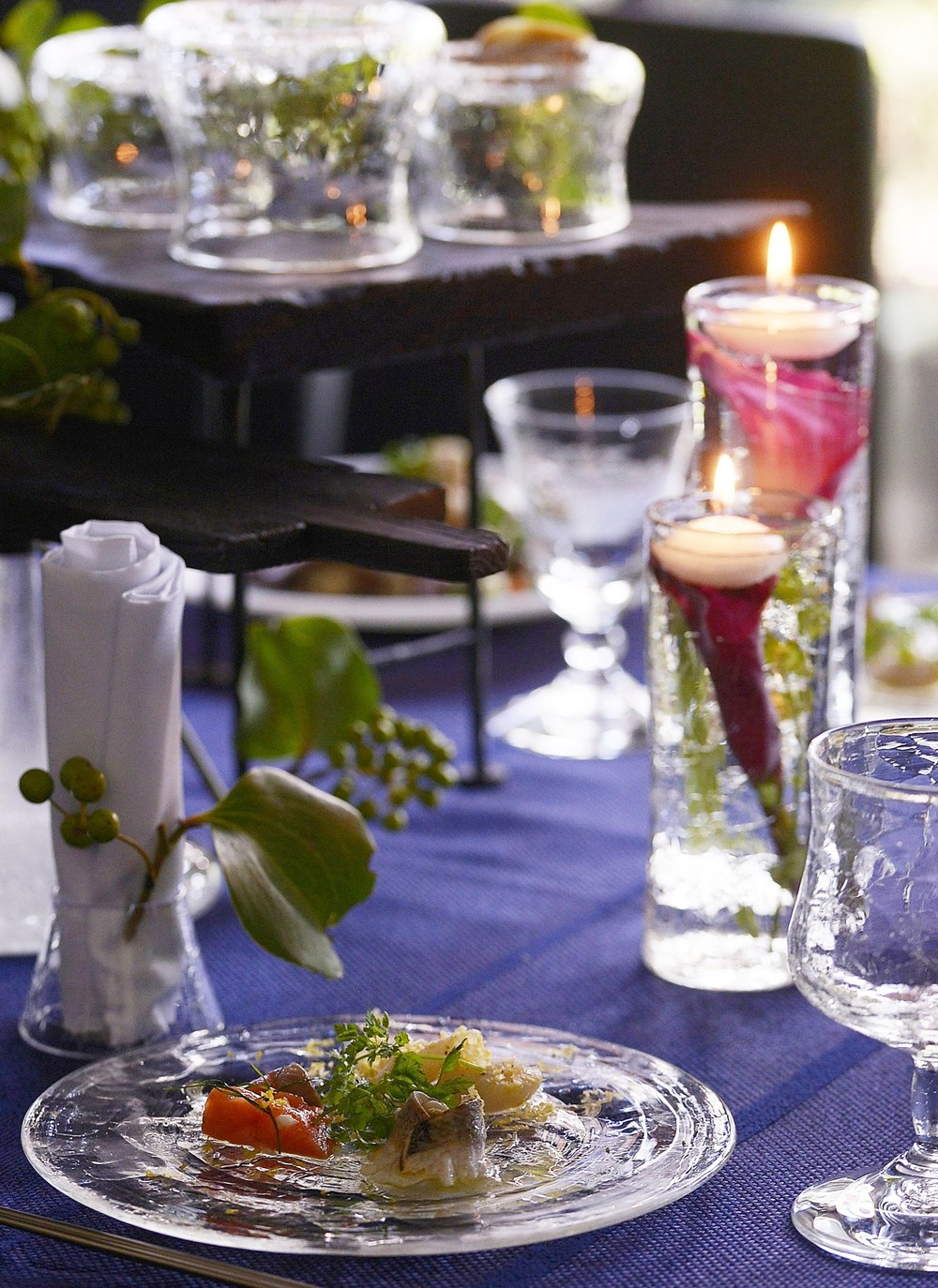 末國清吉 平皿 一昨年のWEB個展で登場したガラスの平皿。アフタヌーンティースタンドには8寸を、アンダープレートには9寸を――と、シーンに合わせて使い分けができる、少し特別感のあるサイズ展開が魅力です。モール模様やクラック模様は、中心に向かってリズムよく強調されるデザインで、置くだけでテーブルに華やぎを添えてくれます。今回は「もう少し気軽に使えるサイズが欲しい」とのお客様のお声をもとに、普段使いにも取り入れやすい7寸を新たに展開。お茶時間のおもてなしにもぴったりのサイズ感で、シースルーのデザインだからこそ、下に敷くリネンや敷物とのコーディネートも楽しめます。テーブルコーディネーターにとっても、自由度の高い一枚。ぜひ直接お料理を盛りつけて、ガラスならではの透け感を活かした演出をお楽しみください。