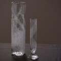 末國清吉 六角花器刷毛目 すらりとした筒形のフォルムが美しい、トールタイプのガラス花器。どちらも縦に伸びるラインが印象的なデザインですが、細身のタイプには、高台部分に八角形の面取りが施されており、足元の造形にさりげない個性が光ります。背の高いタイプは見た目の軽やかさに反して安定感があり、10本ほどの花束も余裕をもって活けられるサイズ感。少量の花でも美しくまとまり、花材を選ばずお使いいただけます。空間に凛とした存在感を与えながら、季節の草花を引き立ててくれる一本です。