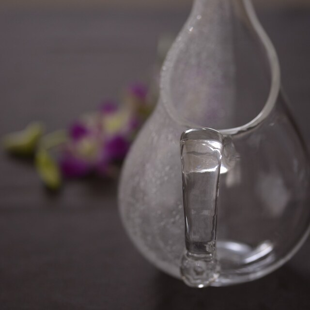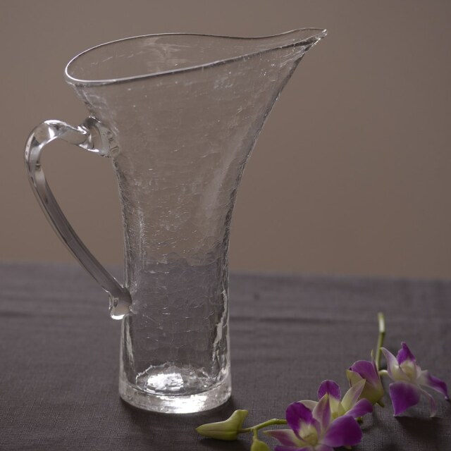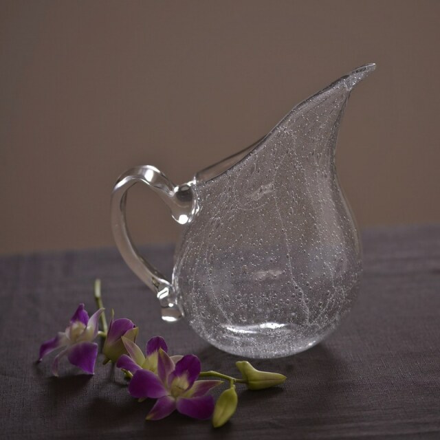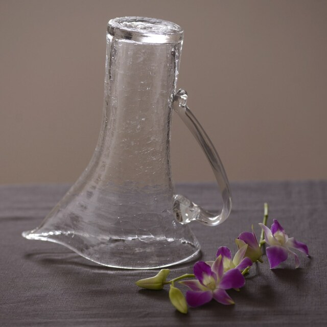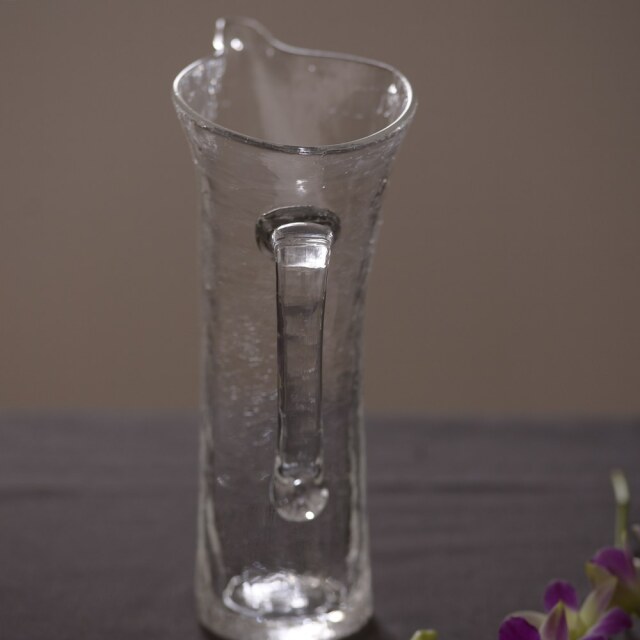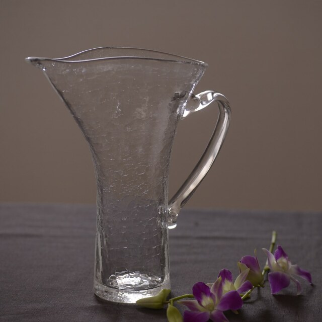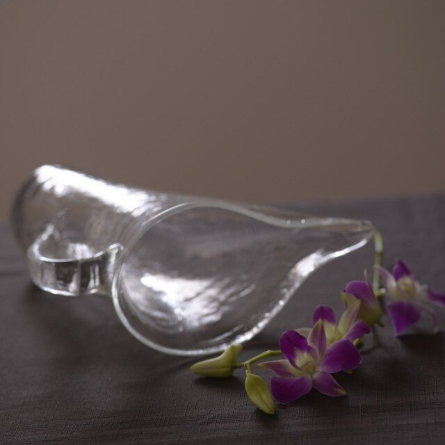 末國清吉 取っ手付き水挿し お花の水挿しとしてはもちろん、ウォーターサーバー代わりとしても活躍してくれる、実用性と美しさを兼ね備えたテーブルウェアです。私自身も自宅で愛用していますが、気がつくといつも花入れとして活躍している気がします。フォルムは、やわらかな丸みを帯びたタイプと、すっきりとしたシルエットが印象的なスタイリッシュタイプの2種類をご用意。夏のあいだは、どこかにさりげなく置いておくだけでも、インテリアとして涼やかな存在感を放ってくれます。