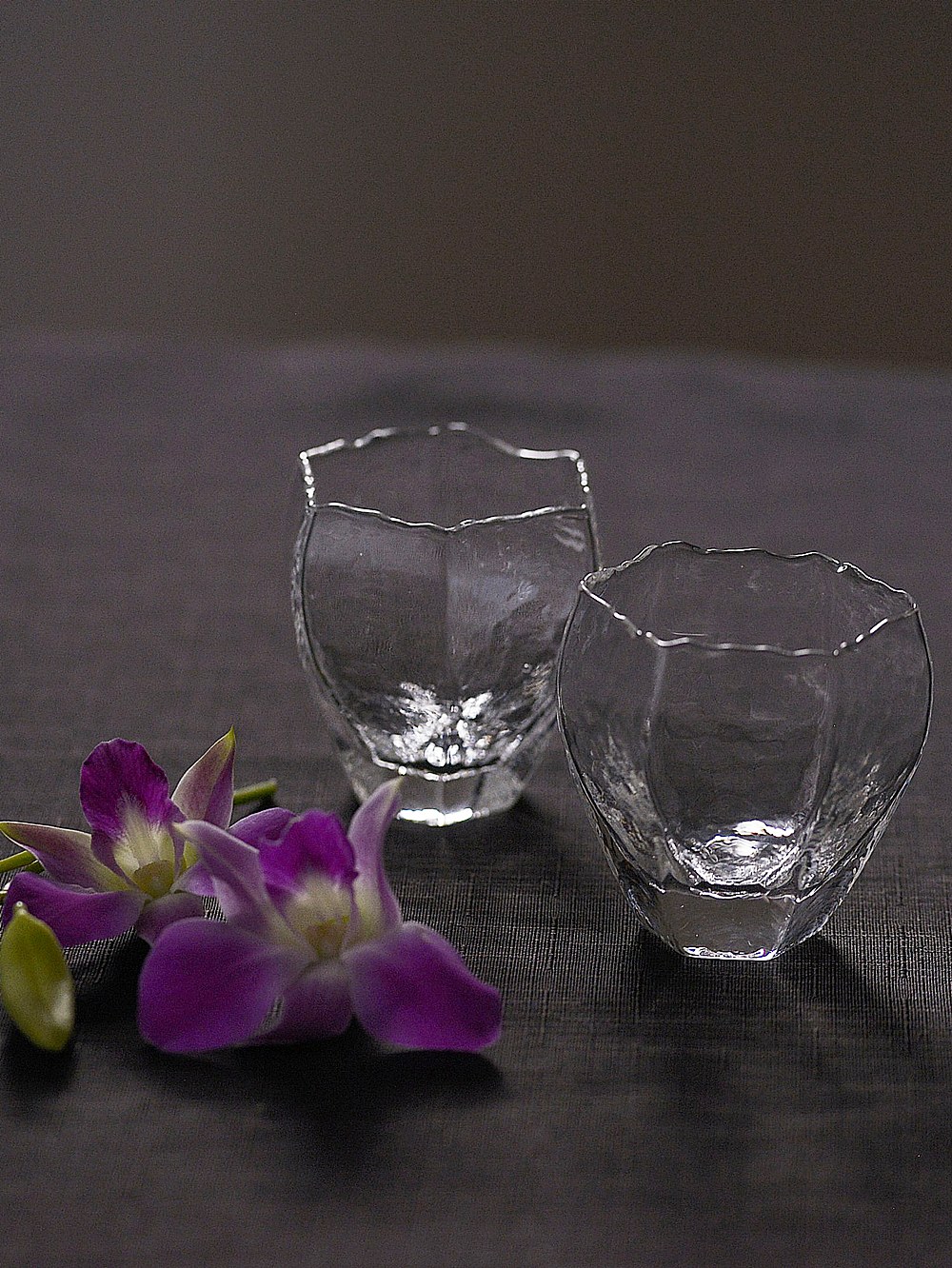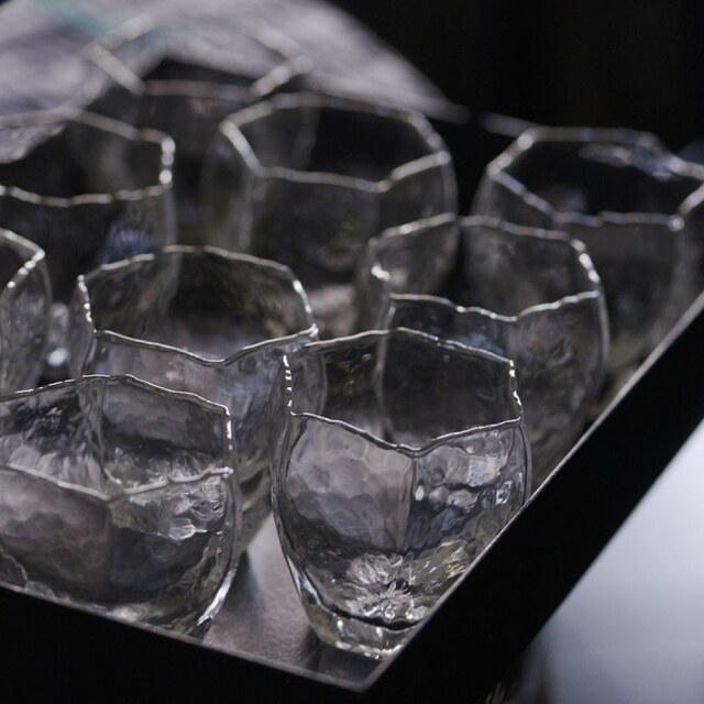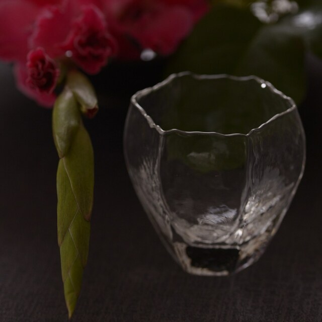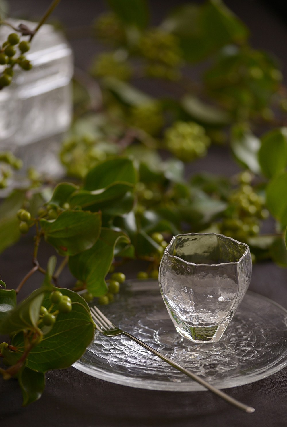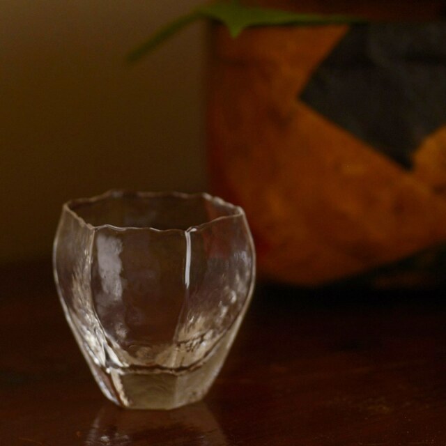 【末國清吉 六角ショットグラス〈クラック〉】先日のお料理交流会でもっとも人気を集めたグラス。末國さんご自身も「これは“推し”なんです」と話してくださいました。ギザギザとした口縁は、「あまりに整いすぎると工業製品のように見えてしまうから」と、あえてクラフト感を残して仕上げているのだそう。クラックの煌めきと、ランダムにカットされた口元が相まって、光をとらえる表情が一層豊かに。容量は満水で約100mlとコンパクトですが、冷茶を楽しむにはちょうどよいサイズ感。お気に入りのピッチャーやポットと合わせて、夏の涼やかなひとときをお楽しみいただけたらと思います。