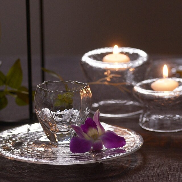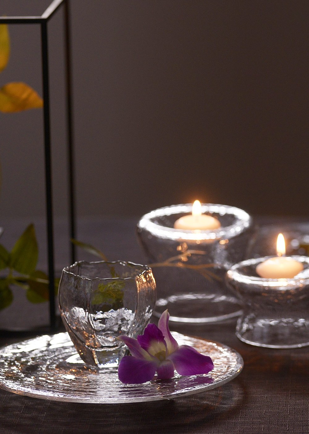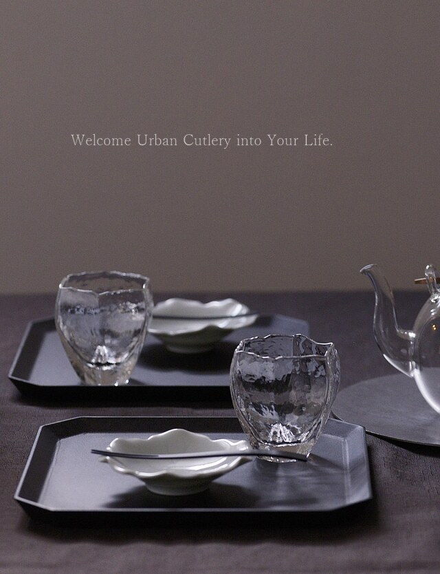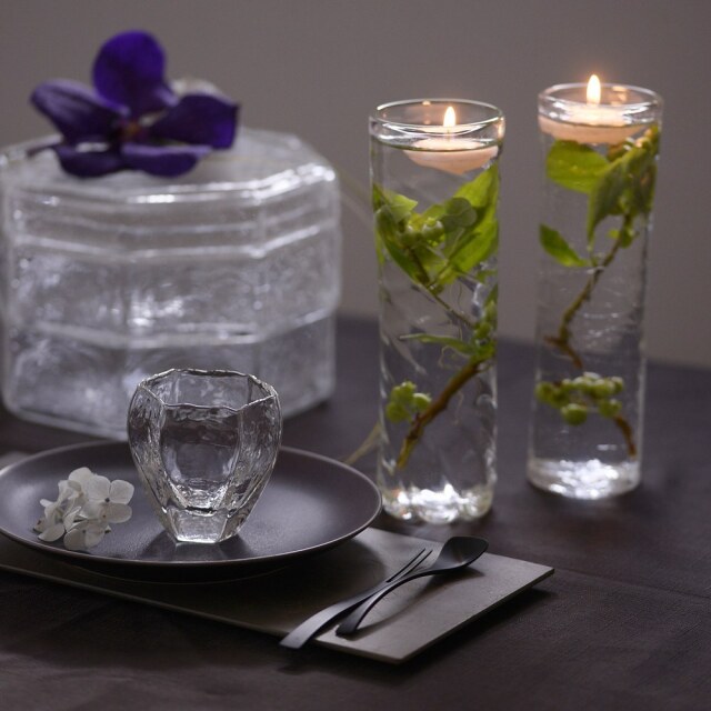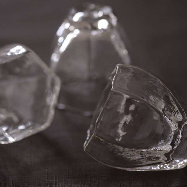 【末國清吉 六角ショットグラス〈クラック〉】先日のお料理交流会でもっとも人気を集めたグラス。末國さんご自身も「これは“推し”なんです」と話してくださいました。ギザギザとした口縁は、「あまりに整いすぎると工業製品のように見えてしまうから」と、あえてクラフト感を残して仕上げているのだそう。クラックの煌めきと、ランダムにカットされた口元が相まって、光をとらえる表情が一層豊かに。容量は満水で約100mlとコンパクトですが、冷茶を楽しむにはちょうどよいサイズ感。お気に入りのピッチャーやポットと合わせて、夏の涼やかなひとときをお楽しみいただけたらと思います。