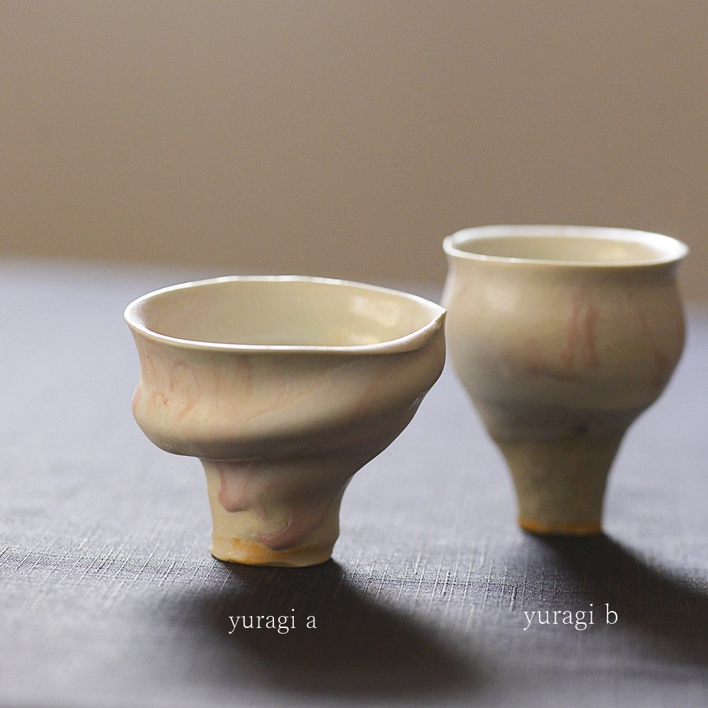 紫蓮 ぐいのみ(red / pink white)コロンと丸みのあるタイプ(約70ml)と、高さのある「Yuragi」タイプ(約100ml)の2種類がございます。「Yuragi」タイプは、ゆらぎのある不均一なフォルムでありながら、どこか凛とした佇まいが魅力です。ラズベリーのような深みのあるredも、いちごミルクのような優しいred whiteも、どちらも手に取るだけで女子力が高まりそうな可愛らしさです