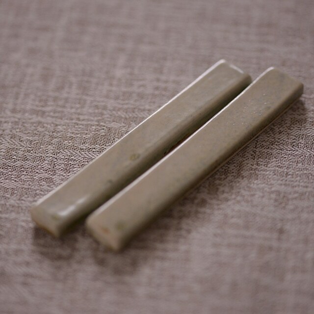 若生沙耶香 箸置き 今回のWEB展でリクエストしていたアイテムのひとつ、箸置きが届きました。シンプルなフォルムながら、藍白釉の美しいグラデーションが楽しめる、魅力たっぷりの仕上がりです。大きさは3種類ご用意しています。(6cm×2cmのスリムなタイプ/3.5cm角のコンパクトな正方形タイプ/9cm×1.5cmの細長いタイプ)